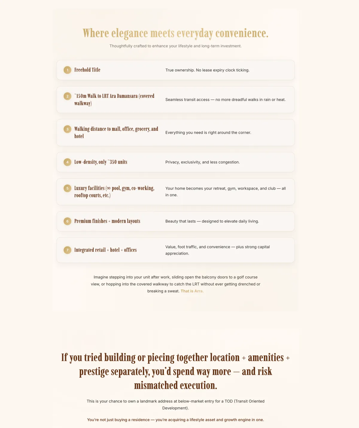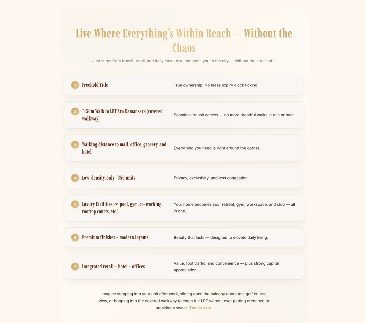 Imagine stepping into your unit after work, sliding open the balcony doors to a golf course view, or hopping into the covered walkway to catch the LRT without ever getting drenched or breaking a sweat. That is Arra.